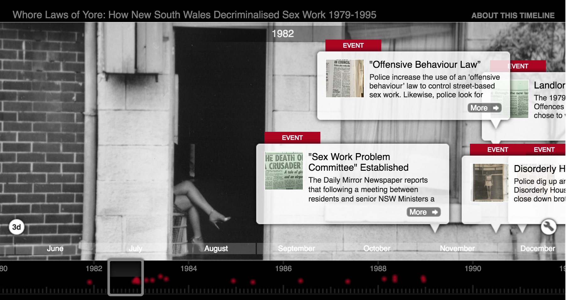 We're building a digital timeline that tells the story of how sex workers fought for the radical reform of prostitution laws during the 1980's and 90's. Drawing on the archives of the sex worker rights movement this work reveals how NSW became the first place in the world to decriminalise all aspects of sex work.